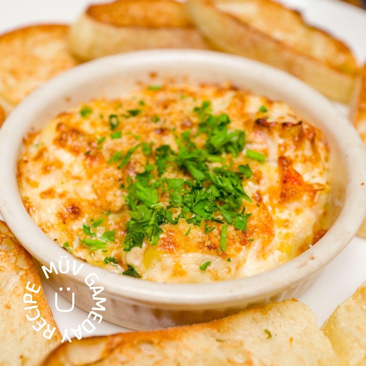 - Carefully remove the dip from the oven (the dish will be hot) and let it cool for a few minutes before serving. Eat warm with toasted baguette slices, tortilla chips, and vegetable sticks for dipping.